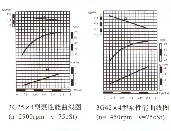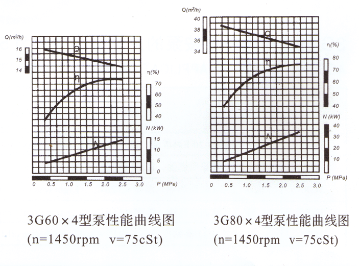 3G系列三螺桿泵性能曲線圖: 各型螺桿泵的性能參數(shù),是在介質(zhì)粘度為75cSt時確定的。性能參數(shù)表中給出的參數(shù)值適用于介質(zhì)粘度為3-760cSt范圍內(nèi),超出這個范圍則根據(jù)用戶提出的性能參數(shù)要求另行確定。 各型螺桿泵性能參數(shù)中給出的排出壓力是最大工作壓力值,在此范圍內(nèi)均能正常工作,其工作范圍見圖。